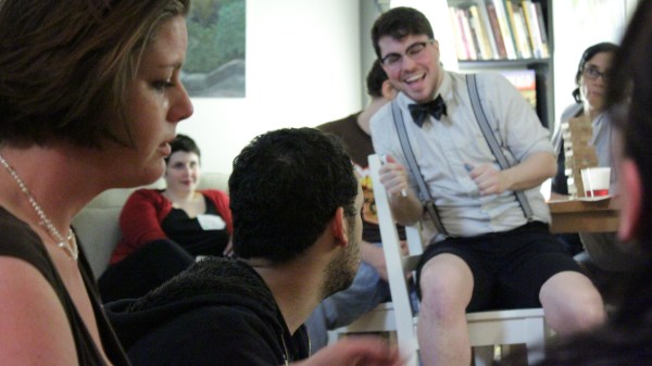 Audience members are fellow guests at the party, with the freedom to wander the space (Sleep No More-style), and have complete control over how interactive the experience is for them: a red nametag means, “Don’t talk to me,” while a green nametag indicates, “Yes, interact with me.”