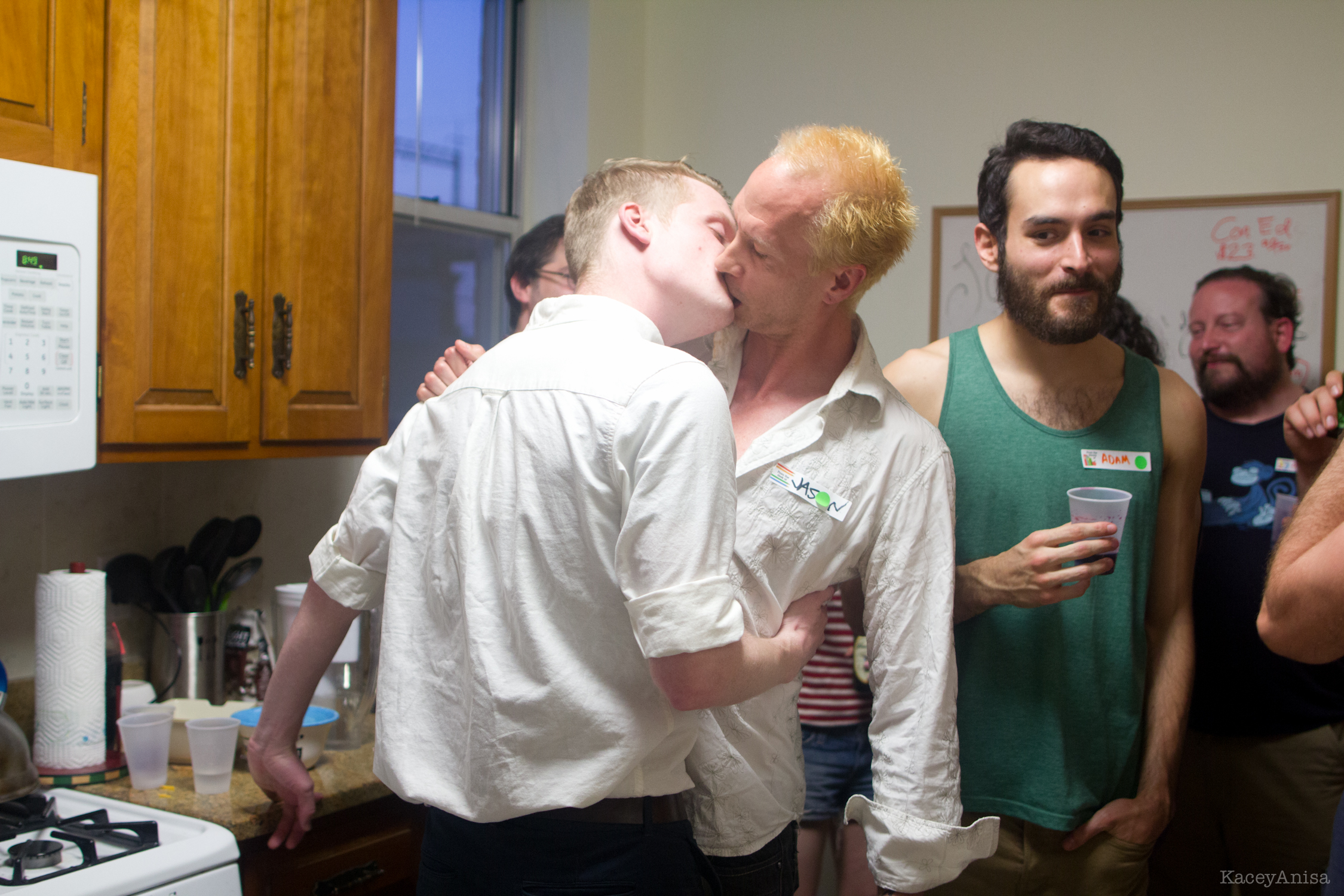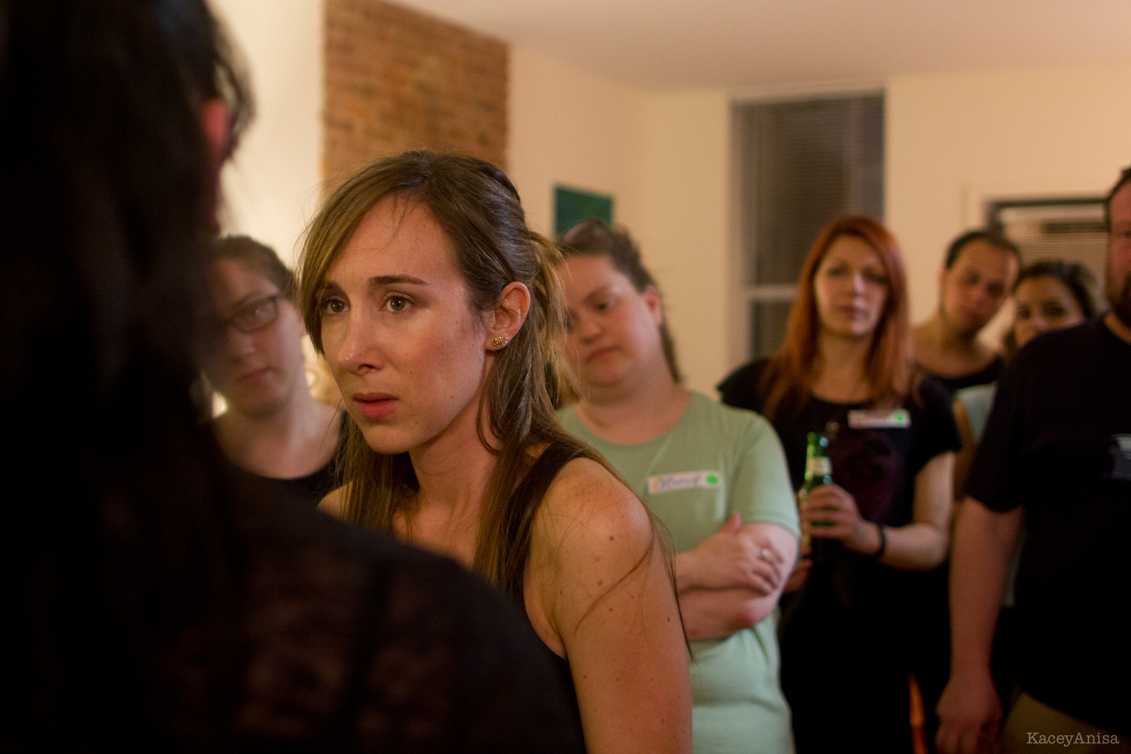 Audience members are fellow guests at the party, with the freedom to wander the space (Sleep No More-style), and have complete control over how interactive the experience is for them: a red nametag means, “Don’t talk to me,” while a green nametag indicates, “Yes, interact with me.”
